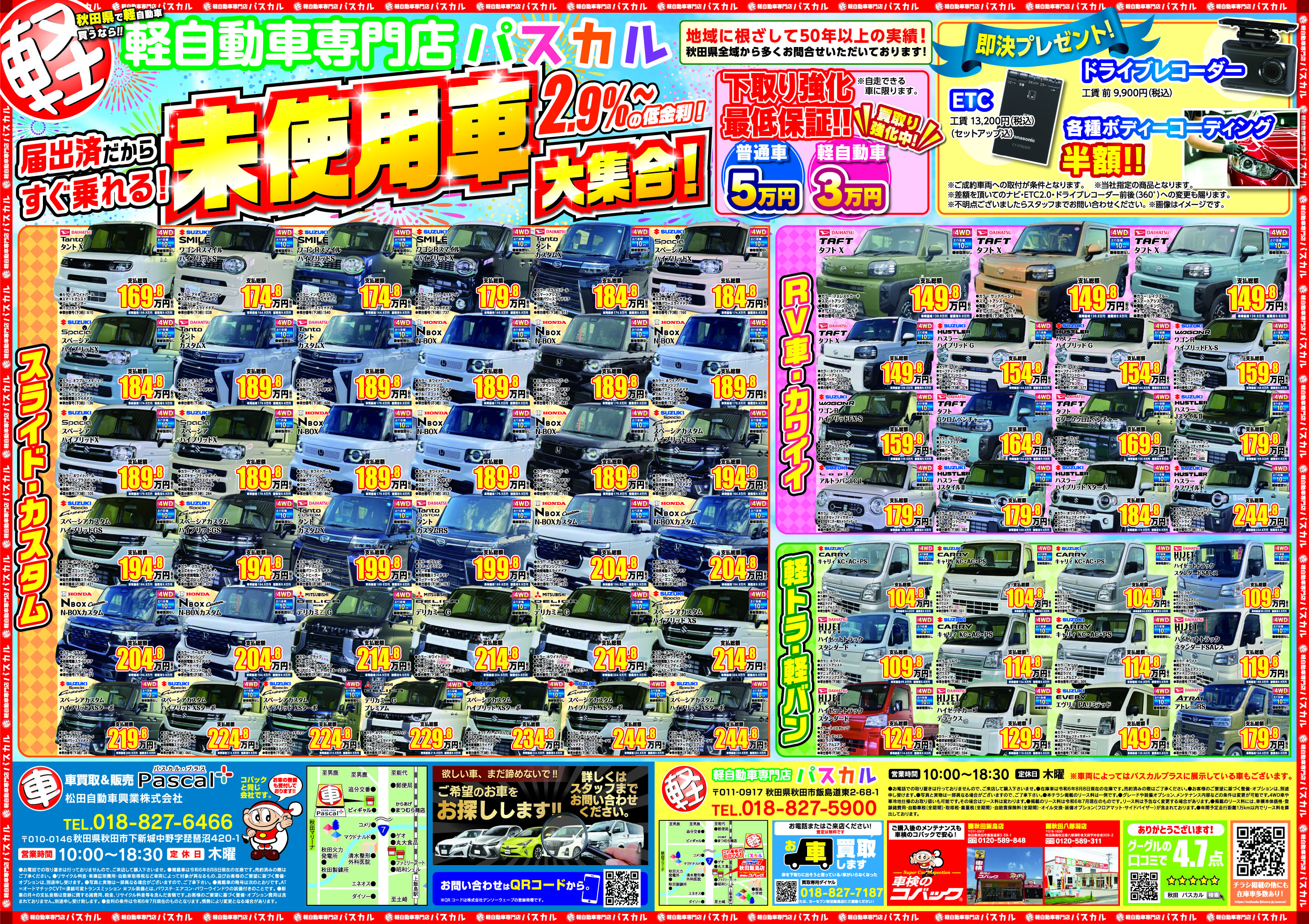 #軽自動車専門店パスカル #車買取&販売パスカルプラス #フラット7秋田 #カーセブン秋田飯島店 #車検のコバック秋田飯島店 #車検のコバック八郎潟店 #松田自動車興業株式会社 #新車 #中古車 #未使用車 #軽自動車専門店 #普通車専門店 #クルマ買取 #査定無料 #車屋 #秋田の軽自動車屋さん #秋田の中古車屋さん #秋田の車買取屋さん #安い #トヨタ #ダイハツ #ホンダ #ニッサン #スズキ #スバル #マツダ #女性が入りやすい #納車式